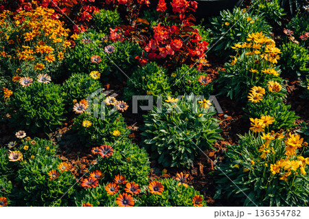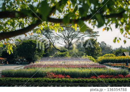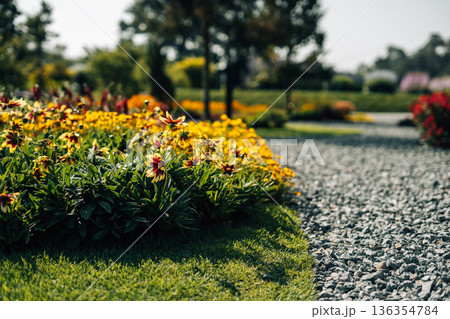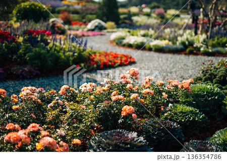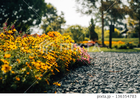 Spring flower gardens in the park and along the pathways in the late morning.