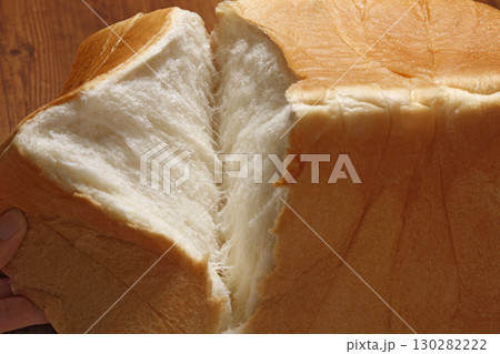 用手掰開一塊方形麵包(特寫)