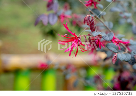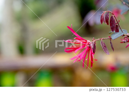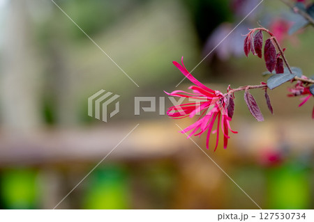大紅的中國風花卉(金梅)的特別畫面,精緻的絲質花朵在柔軟如絲的背景上展現,如同灌木般美麗。