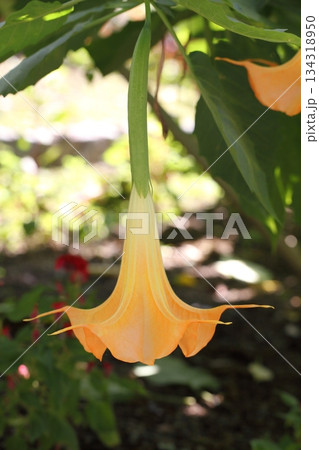秋天花園裡盛開的天使喇叭(韓國韓國)的橙色花朵