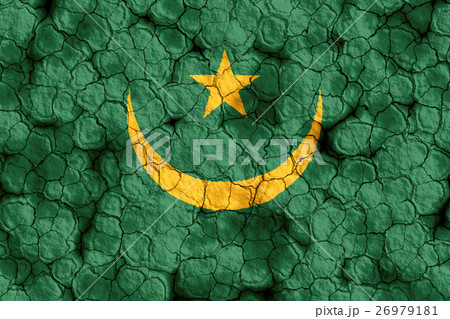 乾裂土壤上的茅利塔尼亞國旗特寫紋理背景(高分辨率 3D CG 渲染∕著色插圖)飢荒乾旱自然災害