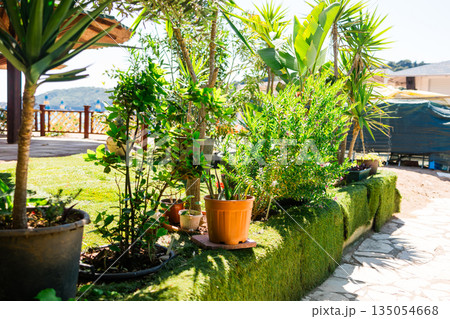 Terrace garden with oleander, yucca, dracaena and banana plants. Domestic landscaping, plant care routines, and tranquil outdoor living supporting harmony with nature.