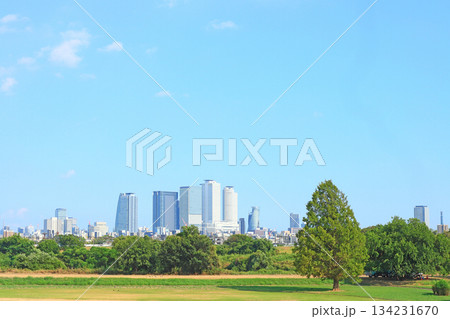 從愛知縣名古屋市莊內川河床眺望名古屋站週邊的摩天大樓