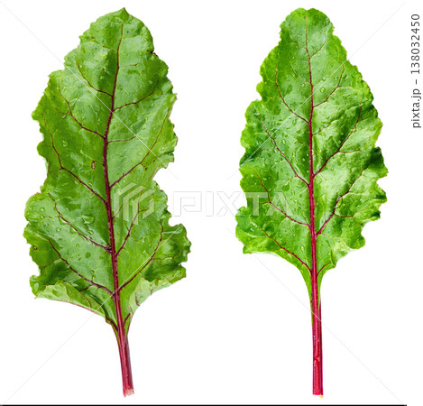 Two fresh green beet leaves with red veins isolated on white. File contains clipping path.