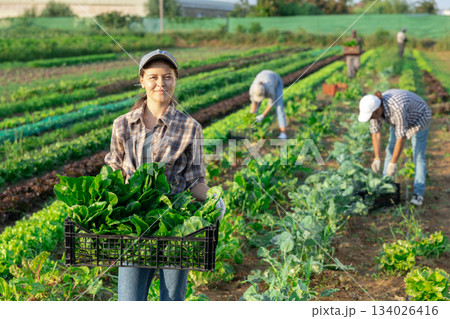 Woman collects crop of chard along with other workers on field