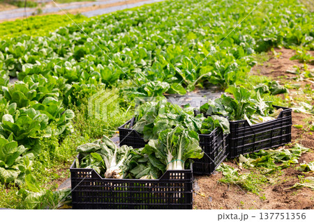Closeup ripe chard in boxes on farm field