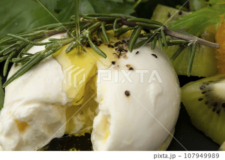 Caprese Salad with Red and Yellow Tomatoes, Mozzarella, Basil, and Olive Oil on Dark Plate