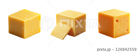 Three different images of yellow cheese cubes, isolated on a transparent white background.