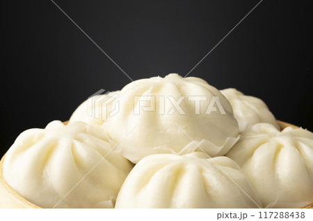 黑色背景下蒸籠裡蒸著滾燙的小籠包的俯視照片