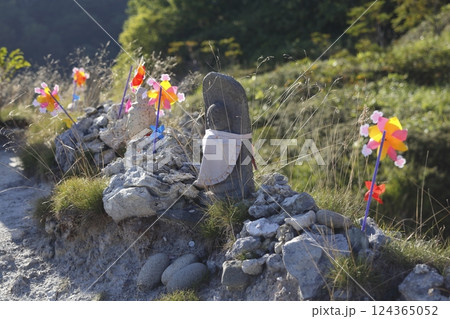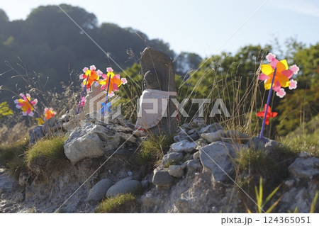 恐山荒涼岩壁上的地藏菩薩像、石雕和風車