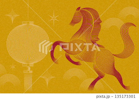 Chinese New Year Illustration ,Year of the Horse with Golden Rearing Horses and Traditional Lunar