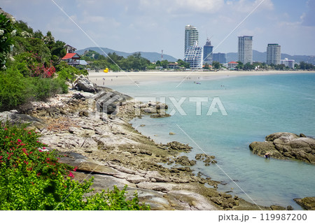 The landscape picture of the tranquil beach and azure sea at Hua Hin, Thailand with skyscraper view on the horizon line and blue sky. Beach rocks and tropical plants.
