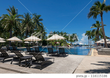 Bedchair at swimming pool by tropical sea in summer , Hua Hin