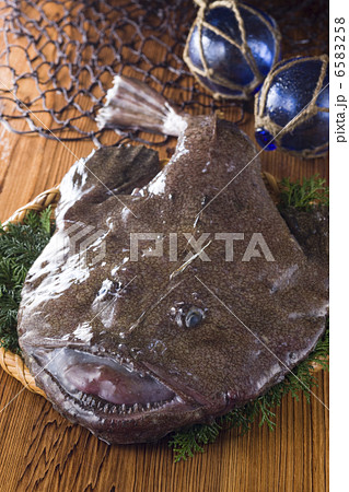 一條鮟鱇魚在一家鮟鱇魚料理餐廳的入口處休息