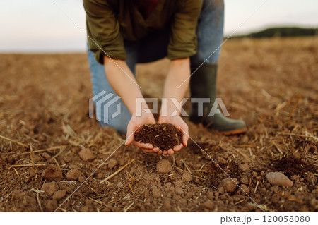 A young woman farmer holds black soil in hand on an agricultural field. Fertility concept, scaling.