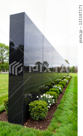 Glossy black monument wall with white veins stretches across a grassy landscape, flanked by neatly trimmed bushes and flowers. Trees are visible in the distant background
