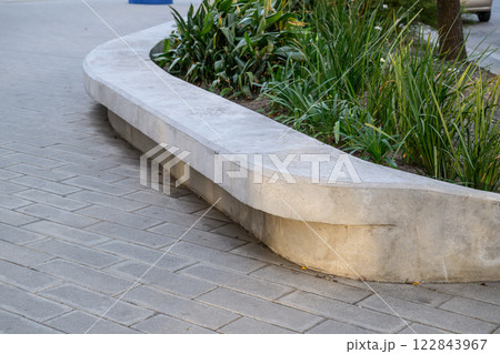 A sturdy concrete bench featuring a plant beautifully placed in the middle of it