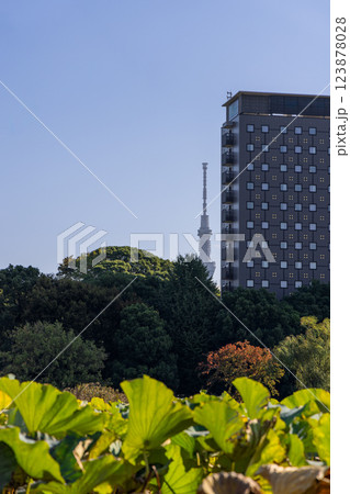 Lotus leaves and green trees at Shinobazu Pond in Tokyo with a modern building and Tokyo Skytree