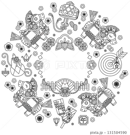 馬年插圖新年設計「Chagu Chagu Umako和幸運符彩色線條畫」方形影印空間