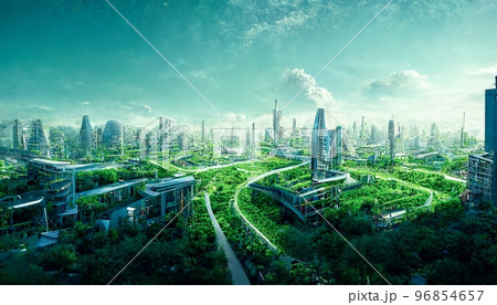 AI generated city covered with green trees and plant. Digital art AI generated image