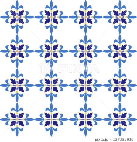 Mediterranean floral seamless pattern of blue red and yellow tiles. Ethnic mosaic design of Portuguese, Italian, Spanish decorative motifs. Ornament for home textile or ceramic. Vector illustration