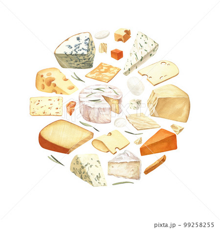 Watercolor different cheese round frame template. Hand draw circle card background with food objects on isolated white. Drink for food menu, cafe, wine list, label, banner, flyer, brochure