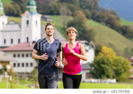Couple doing sport running in the mountains