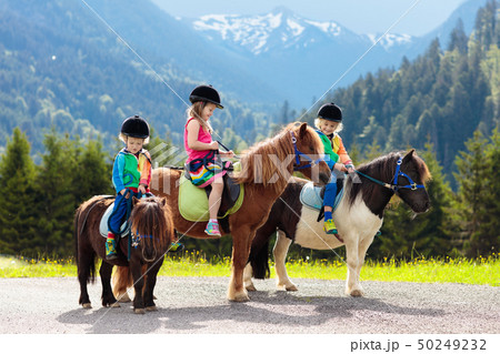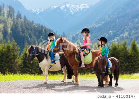 Kids riding pony. Child on horse in Alps mountains