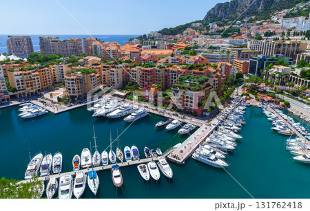 Monte Carlo, Monaco. Vibrant coastal harbor scene featuring a busy marina