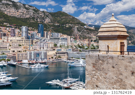 Monaco, Panoramic view of Monte Carlo coastline, harbor and Mediterranean Sea