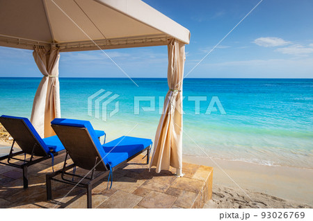 Caribbean beach with gazebo and lounge chairs, Montego Bay, Jamaica