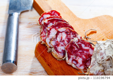 Delicious smoked salami sausage with salt, pepper, spices and herbs