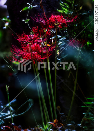 茅崎小出川散步道兩旁盛開的鮮紅色石蒜花和鋼塔