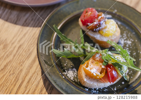 夏季蔬菜、義式烤麵包、番茄、芝麻菜、起司、開胃菜