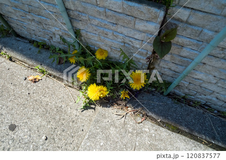 蒲公英生長在排水溝的縫隙中