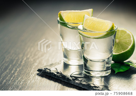 Glass of tequila with slice of lime