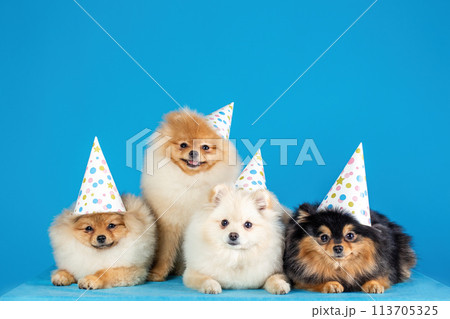 A group of four pomeranian spitz in festive hats. Dogs celebrating. Isolated on a blue background.