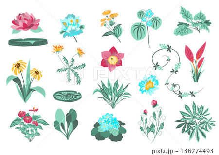 Flower and plants isolated set. Garden and wild foliage, green leaves, blooming wildflowers, flowering plants, beautiful herbs. Bundle of floral elements. Vector illustration in hand drawn design