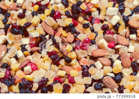 Mix of candied fruits, nuts and raisins for a quick bite (Selective focus, vintage photo effect)