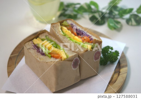含有大量南蠻雞肉和生菜的橫切面三明治照片