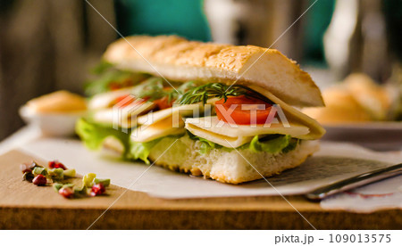 Sandwich portions with fresh vegetables on wooden tray. Culinary presentation, nutrition, and gourmet lifestyle in cafe dining experience.