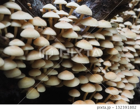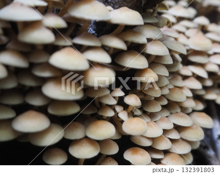 倒下的樹上密密麻麻地生長著白色的蘑菇(afr20251022073944)