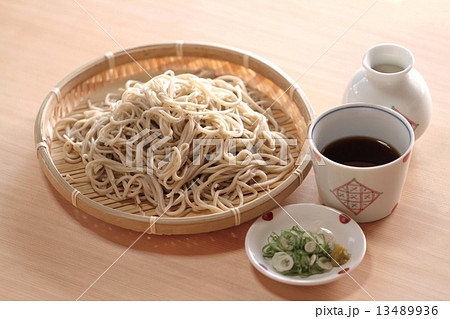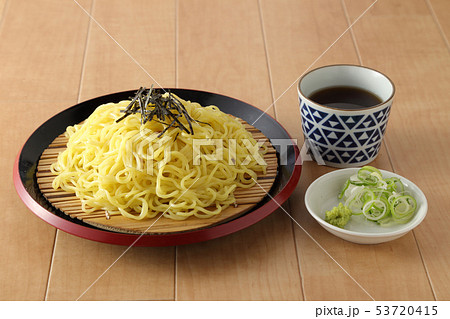 boiled cold yakisoba or zuru soba Japanese noodles topping dry slice seaweed on plate dipping soy sauce