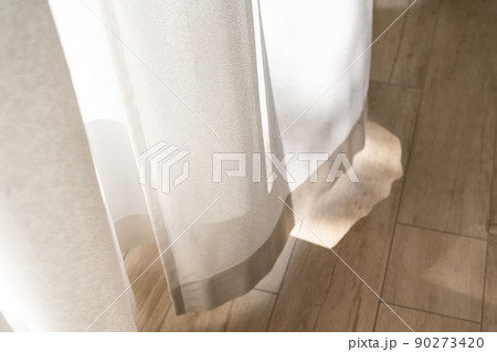一個假期的家庭形象,蕾絲窗簾圖案的陰影反映在地板上