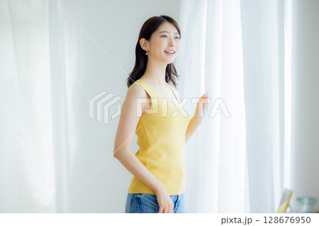 一位身穿睡衣的年輕女子坐在窗邊,玩著智慧型手機