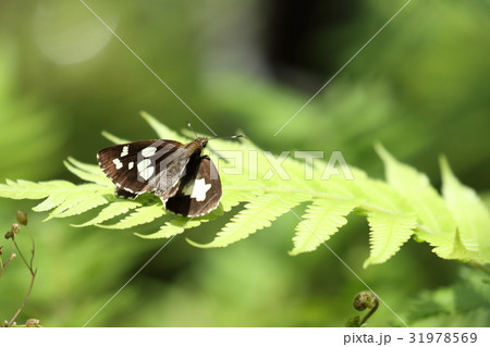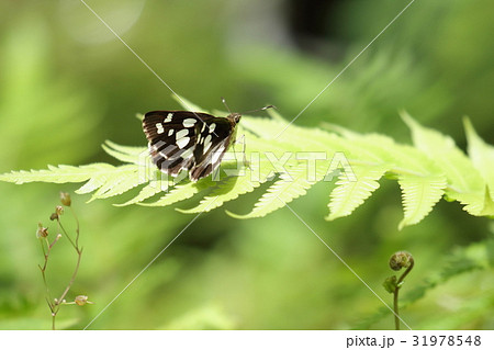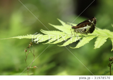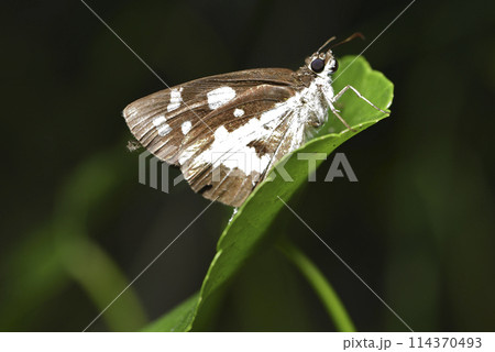 一隻大白紋弄蝶棲息在綠色葉子上