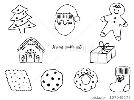 聖誕餅乾組、質感色鉛筆、手繪線條藝術插圖