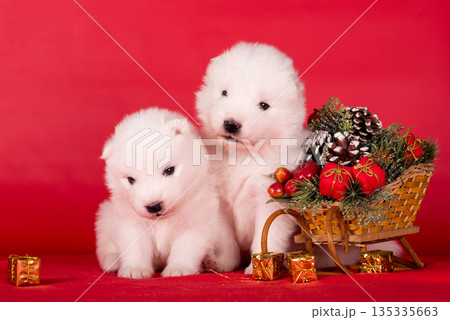 Christmas puppies. Samoyed puppies dogs on Christmas red background