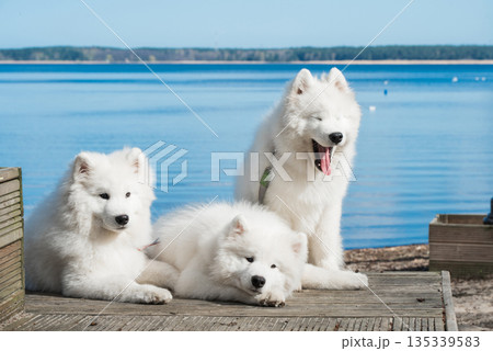 Funny three Young White Samoyed Dog on wooden bridge in park, happiness and friendship