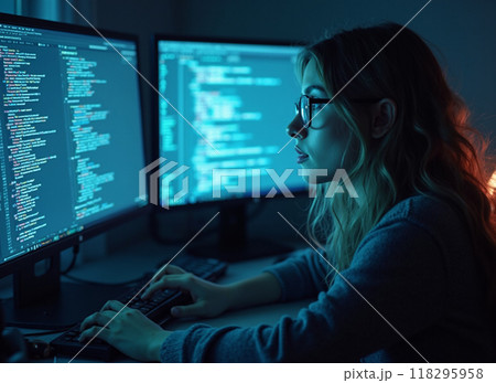 一位女士在藍光照射的房間裡專心致志地使用電腦,享受安靜的時光